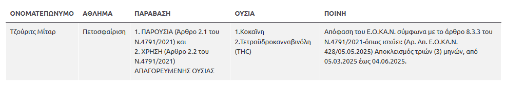 Βόλεϊ: Τιμωρία τριών μηνών στον Τζούριτς του Ολυμπιακού για χρήση κοκαΐνης! (ΦΩΤΟ) 29/05/2025 Ο Εθνικός Οργανισμός Καταπολέμησης Ντόπινγκ ανακοίνωσε την επιβολή αποκλεισμού τριών μηνών στον διεθνή κεντρικό του Ολυμπιακού, Δημήτρη Τζούριτς, λόγω χρήσης απαγορευμένων ουσιών, οι οποίες δεν θεωρούνται βοηθητικές προς την απόδοση. Η μία ουσία είναι η κοκαΐνη. Όσο για τη δεύτερη ουσία που αναφέρει ο ΕΟΚΑΝ, η Τετραϋδροκανναβινόλη (THC), πρόκειται για την κύρια ψυχοδραστική ουσία που υπάρχει στο φυτό της κάνναβης. Η τιμωρία ολοκληρώνεται στις 4 Ιουνίου, καθώς άρχισε από την ημέρα που βρέθηκε το πρώτο θετικό τεστ, στις 5 Μαρτίου. Επομένως, ο 36χρονος κεντρικός θα μπορεί κανονικά να προετοιμαστεί για την επόμενη αγωνιστική περίοδο. Η ανακοίνωση: ΔΙΑΒΑΣΤΕ ΕΠΙΣΗΣ