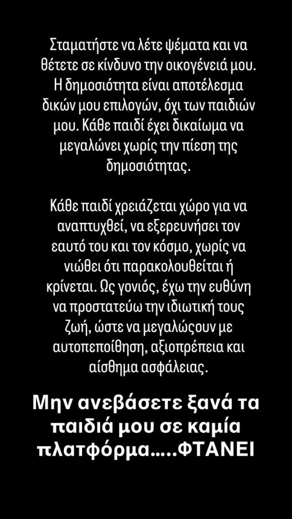 Ξέσπασε ο Γιάννης: «Μην ανεβάσετε ξανά τα παιδιά μου σε καμία πλατφόρμα» (ΦΩΤΟ) 06/10/2025 Ο Γιάννης Αντετοκούνμπο εξέφρασε την έντονη ενόχλησή του μέσω Instagram για τα πρόσφατα δημοσιεύματα που αφορούσαν την οικογένειά του. Ο Έλληνας σούπερ σταρ του NBA ζήτησε να σταματήσει οποιαδήποτε ανάρτηση φωτογραφιών ή αναφορά στα παιδιά του, τονίζοντας ότι δεν θέλει πλέον να εμφανίζονται σε μέσα ενημέρωσης και κοινωνικά δίκτυα. «Μην τα ανεβάσετε ξανά σε καμία πλατφόρμα, φτάνει», ήταν το ξεκάθαρο μήνυμα του Αντετοκούνμπο, επισημαίνοντας την ανάγκη σεβασμού για την προσωπική ζωή της οικογένειάς του. Αναλυτικά το μήνυμα του Γιάννη : «Σταματήστε να λέτε ψέματα και να θέτετε σε κίνδυνο την οικογένειά μου. Η δημοσιότητα είναι αποτέλεσμα δικών μου επιλογών, όχι των παιδιών μου. Κάθε παιδί έχει δικαίωμα να μεγαλώνει χωρίς την πίεση της δημοσιότητας. Κάθε παιδί χρειάζεται χώρο για να αναπτυχθεί, να εξερευνήσει τον εαυτό του και τον κόσμο, χωρίς να νιώθει ότι παρακολουθείται ή κρίνεται. Ως γονιός, έχω την ευθύνη να προστατεύω την ιδιωτική τους ζωή, ώστε να μεγαλώσουν με αυτοπεποίθηση, αξιοπρέπεια και αίσθημα ασφάλειας. Μην ανεβάσετε ξανά τα παιδιά μου σε καμία πλατφόρμα… ΦΤΑΝΕΙ». ΔΙΑΒΑΣΤΕ ΕΠΙΣΗΣ
