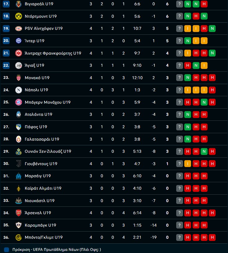 Youth League: Η βαθμολογία μετά την ισοπαλία του Ολυμπιακού με την Αϊντχόφεν 04/11/2025 Ο Ολυμπιακός Κ19 συνέχισε με ισοπαλία (2-2) απέναντι στην Αϊντχόφεν στη League Phase του Youth League, για την 5η αγωνιστική. Μετά από αυτό το αποτέλεσμα, οι «ερυθρόλευκοι» έχουν φτάσει τους 7 βαθμούς και παραμένουν στη 12η θέση του βαθμολογικού πίνακα. Η βαθμολογία: Το σύστημα διεξαγωγής του Youth League Η League Phase του Youth League, όπου βρίσκεται ο Ολυμπιακός, λειτουργεί με τρόπο αντίστοιχο με εκείνη του UEFA Champions League, αλλά περιορίζεται στις έξι πρώτες αγωνιστικές, με τους ίδιους αγώνες να διεξάγονται και στις δύο διοργανώσεις (τρεις εντός και τρεις εκτός έδρας). Η διαδρομή των εγχώριων πρωταθλητών (Domestic Champions), όπου βρίσκεται ο ΠΑΟΚ, θα αποτελείται από τρεις γύρους που θα διεξαχθούν με το σύστημα νοκ-άουτ με διπλούς αγώνες (εντός και εκτός έδρας). Στο τέλος αυτών των αρχικών φάσεων θα διεξαχθεί μια ενιαία φάση νοκ-άουτ με αγώνες ενός αγώνα, ξεκινώντας από τον γύρο των 32. Οι σύλλογοι που θα καταταγούν στις θέσεις 1 έως 6 στη βαθμολογία της League Phase θα προκριθούν απευθείας στον γύρο των 32 και θα αντιμετωπίσουν τους συλλόγους που θα βρεθούν στις θέσεις 17 έως 22. Οι σύλλογοι που θα καταταγούν στις θέσεις 7 έως 16 θα αντιμετωπίσουν τους 10 συλλόγους που προκρίνονται μέσω της διαδρομής Domestic Champions στον γύρο των 32. Οι σύλλογοι που θα βρεθούν από τη θέση 23 και κάτω στη βαθμολογία της League Phase θα αποκλειστούν από το Youth League. Το τουρνουά θα ολοκληρωθεί με το Final Four (ημιτελικοί και τελικός) που θα διεξαχθεί σε ουδέτερο γήπεδο. Για τους 16, τους προημιτελικούς και τους ημιτελικούς, τα ζευγάρια θα καθοριστούν με κλήρωση. ΔΙΑΒΑΣΤΕ ΕΠΙΣΗΣ